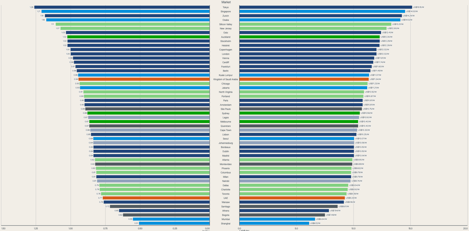 Tokyo (US$15.2/W), Singapore (US$14.5), and Zurich (US$14.2) remain the most expensive markets. Paris, Amsterdam, Madrid, and Dublin are catching up as demand grows and supply chains mature, while Lagos has normalized after early setup cost spikes.