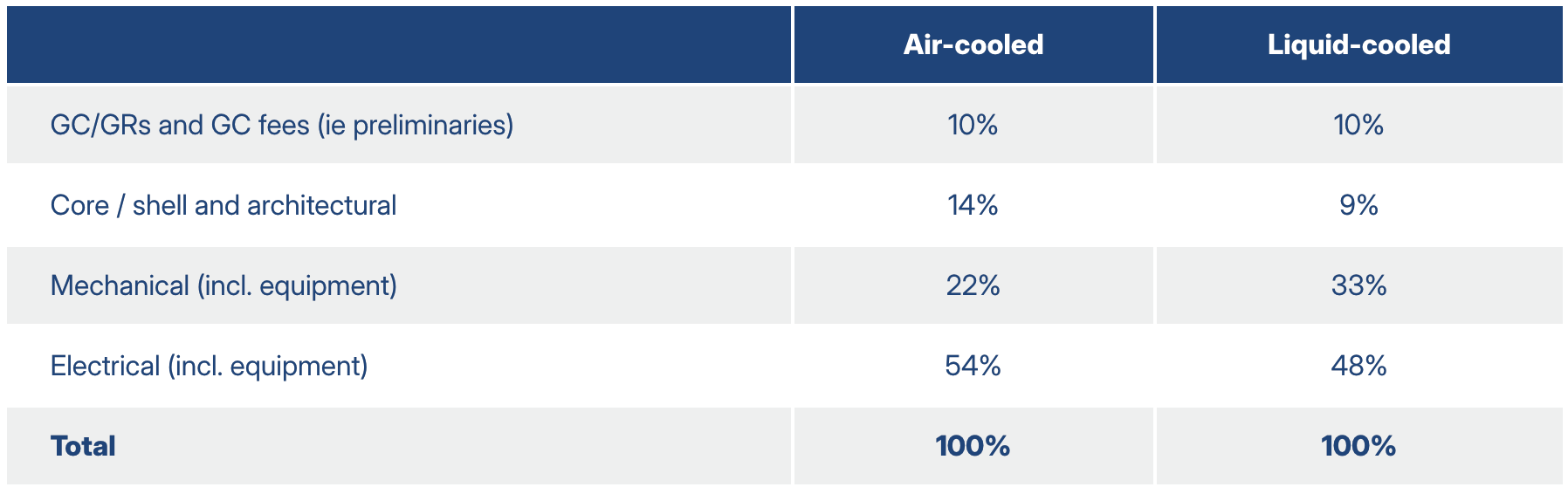 AI-ready, liquid-cooled data centers remain significantly more expensiveâtypically 7â10% higher than air-cooled buildsâdue to higher power density, technical complexity, and specialized cooling systems.