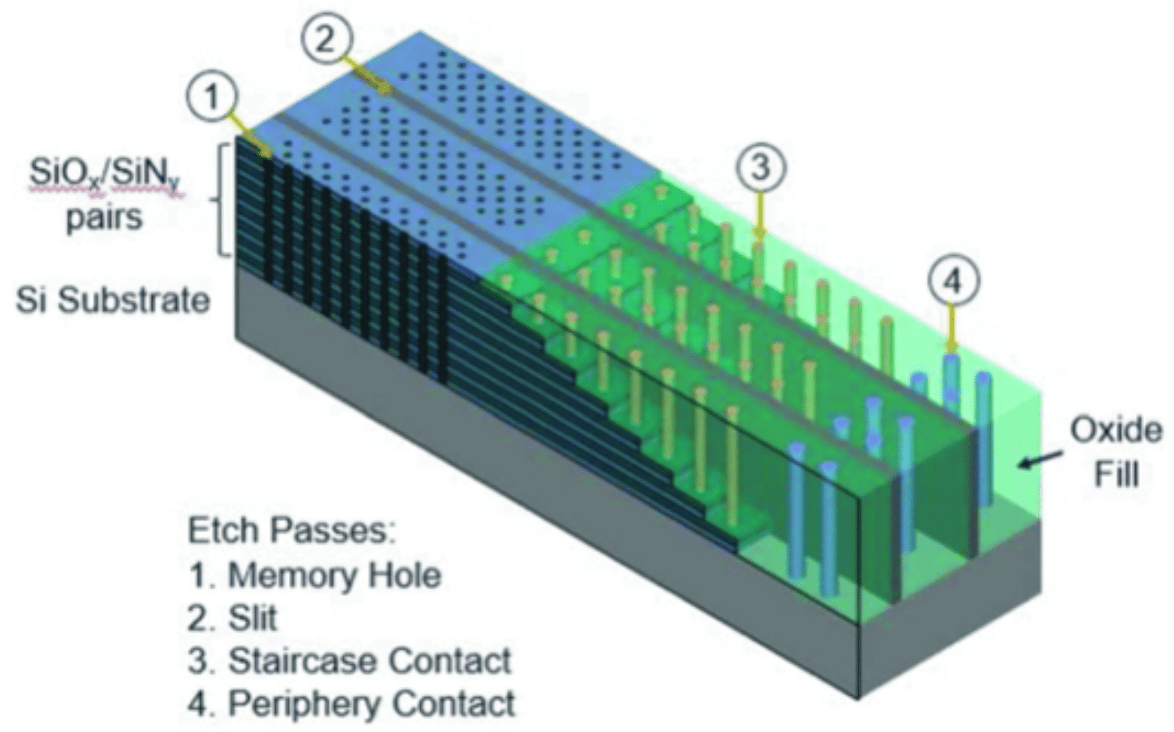 Modern 3D NAND relies on drilling extremely narrow vertical holes through stacks that can be several microns tall. These holes are well below 100 nm in diameter and must remain almost perfectly vertical from top to bottom. Any bowing, tapering, or misalignment can cause electrical interference between cells, making higher-density storage modes like QLC and PLC (quad-level cell and penta-level cell NAND, where each memory cell stores four or five bits by using multiple voltage levels) unreliable.